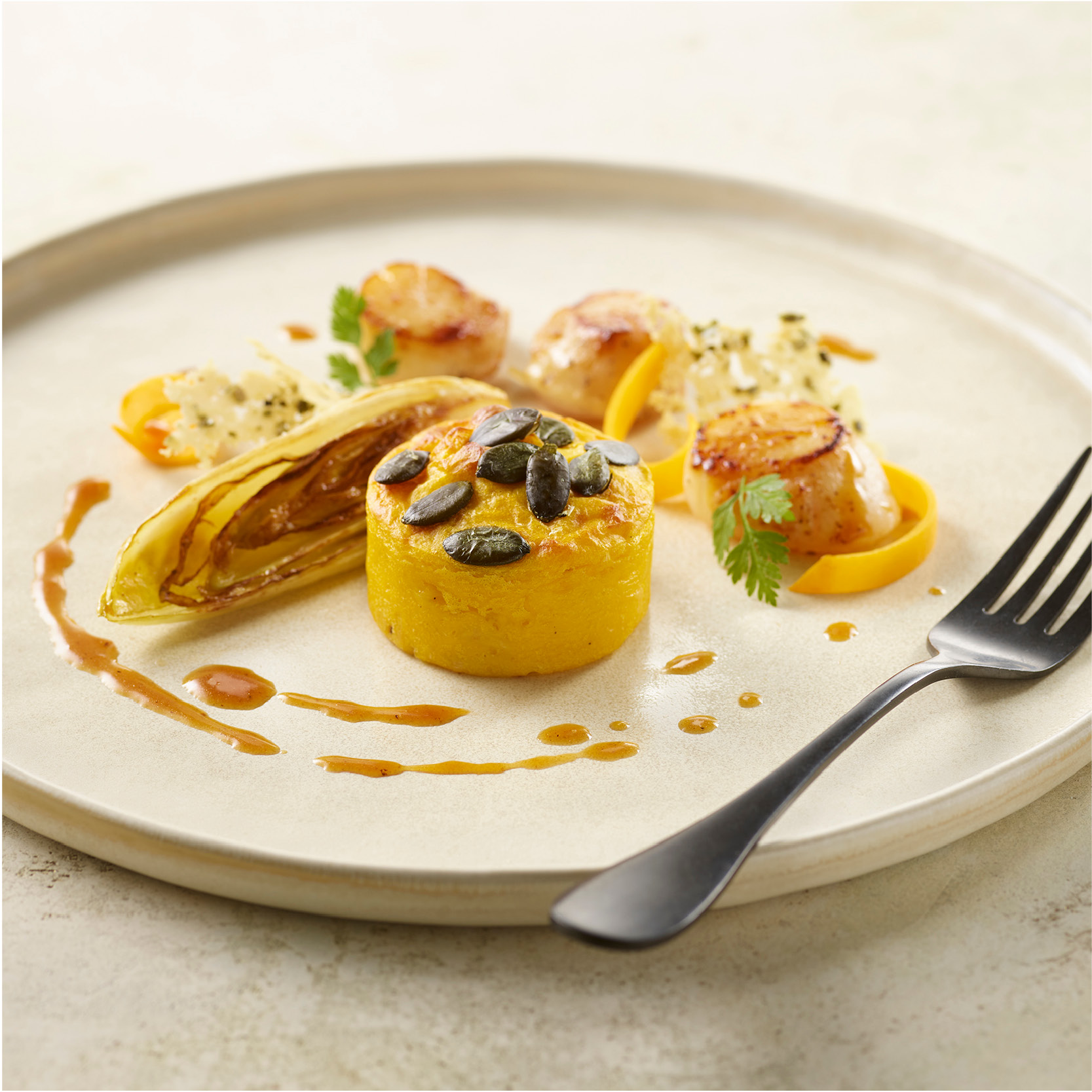 Designed for all types of foodservice, the Butternut Squash Mousse is pre-cooked, allowing for quick and easy preparation, whether in a high-speed oven (in just 1 minute and 40 seconds), a traditional oven, or a microwave.Thanks to the generous topping of pumpkin seeds applied by hand, this side dish stands out with its careful and artisanal presentation.